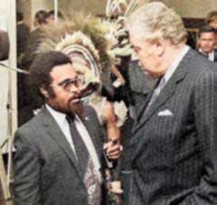 About 10,000 people watched the main ceremony at Port Moresby’s Sir Hubert Murray Stadium. Sir John Guise, Sir John Kerr, HRH Prince Charles, the PNG Prime Minister, Mr Somare, and the Australian Prime Minister, Mr Whitlam, watched with leaders of more than 20 other nations as the Australian flag, floating in a gentle breeze, was lowered by 1 Battalion Pacific Islands Regiment. The flag was folded and presented to Sir John Guise, who then presented it to the Australian Governor-General, Sir John Kerr, and said: